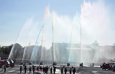 一斉放水試験では新春の青空に向かって7色の水柱が立った。
