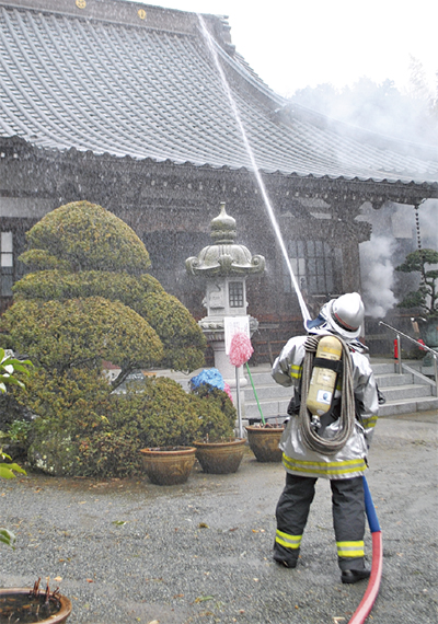 訓練は庫裏から出火したことを想定。火災を発見した住職は「火事だー」と叫び、消火器で初期消火を試みた。家族が119番へ通報。寺の檀家役員2人がダミーの本尊を本堂から運び出した。駆けつけた消防署員と消防団員が放水を行い、参加者らは火災発見から鎮火まで各自の行動を確認。訓練の様子を地域住民が見学した。