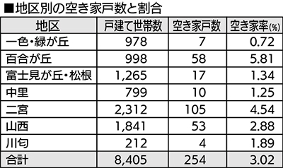 戸建て世帯数に占める空き家の割合は町全体で3・02%。地区別では二宮が105戸で空き家率4・54%、百合が丘は58戸で同5・81%だった。
