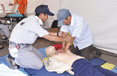 消防署員の手ほどきで心肺蘇生法を体験した中井町の森鶴松さん(77)は、「肋骨が折れてしまうんじゃないかというほど強く胸を押すとは思わなかった。AEDは初めて触ったが、機械が人間の声で手順を教えてくれるので簡単に使えた」と話していた。