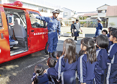 救急車とポンプ車、広報車を目の前に消防の仕事についても学び、園児たちは「なぜ車に赤いライトが付いているの」「ポンプ車の水はどこから来るの」などと質問。23日の勤労感謝の日にちなみ、感謝のメッセージと絵を消防職員へ贈った。