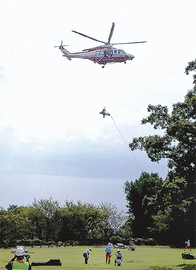 着陸地点となる二宮町山西のあいおいニッセイ同和損保湘南東保園グラウンドでは、二宮消防の救急隊が待機。機体から要救助者をストレッチャーで運び出し、救急車で搬送するまでの流れを実践した。