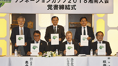 平塚市と茅ヶ崎市、大磯町の2市1町で、来年5月に開催される15歳以下の国際的なサッカー大会「ワンネーションカップ2018湘南大会」に向け、13日に平塚市のホテルで覚書の締結式があった。大会主催者で、ドイツでスポーツ施設などを運営する公益法人スポルトガルデンのチェアマン、ハンス・ウルリッヒ・バルデさんは「世界は一つという考えに貢献する大会。さまざまな国際交流につなげてほしい」と、初のアジア開催に期待を込めた。