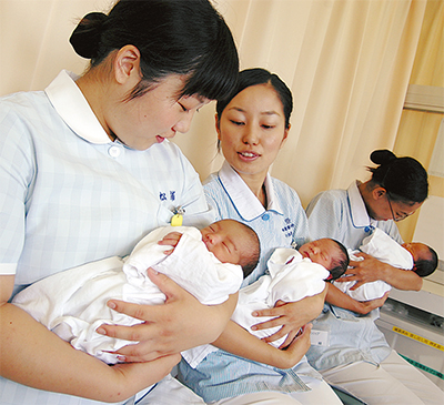 参加者は院内見学や進路相談、看護師指導のもと入院患者の足を洗ったり、食事の介助、赤ちゃんを抱っこしたりと、貴重な体験に真剣な眼差しで取り組んでいた。