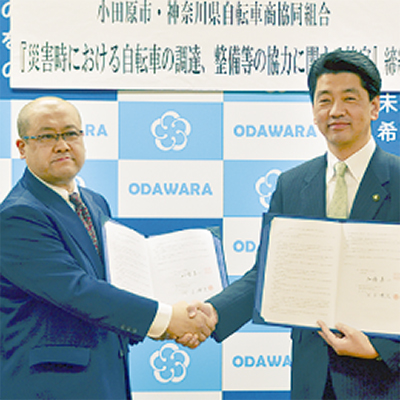 市と県自転車商協同組合(河本博文理事長)の「災害時における自転車の調達、整備等の協力に関する協定書」の締結式が4月18日に市役所で行われた。