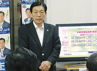 大野眞一氏は、市議会議員通算7期の経験、市議選でトップ当選を続けてきた地盤を基礎に、市民税10%減税や市長報酬50%カットなどの政策を訴えた。また、「減税日本」の推薦を受け、選挙中は河村たかし名古屋市長も応援に駆けつけた。しかし小田原市民の選択は、大野氏による変革よりも加藤氏の続投だった。