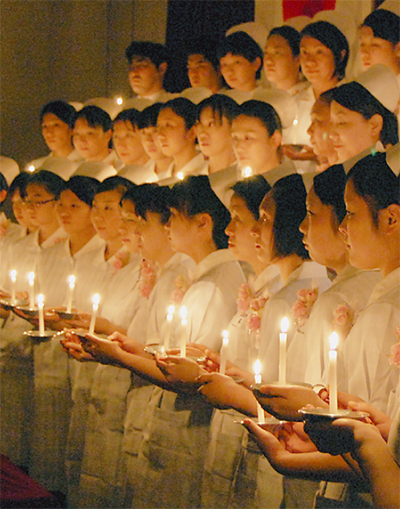 看護師としての責任感や意識の高揚を目的に毎年おこなわれているこの儀式。今回ナースキャップを受け取ったのは高等看護専門学校第19回生42人、看護専門学校准看護学科第49回生43人。