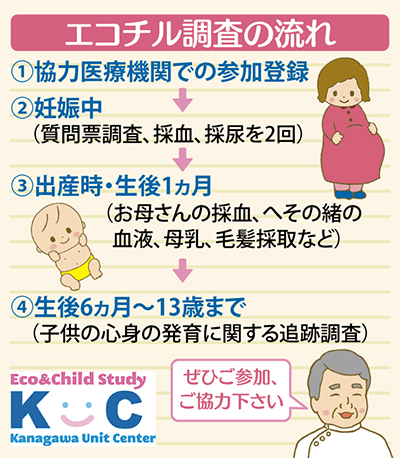 環境省は全国プロジェクト「子どもの健康と環境に関する全国調査(エコチル調査)」を実施し、生活環境の中で触れる物質や生活習慣が子どもの成長や病気にどう関係しているのか調査している。神奈川県内は横浜市金沢区、大和市、小田原市の3地域が対象。対象地域に住む妊婦に調査への協力を呼びかけている。