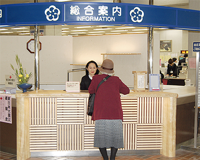 案内所の受付をする堀口祐利子さんは「香りが良くてすばらしいという声が寄せられています。居心地もいいですよ」と話し、笑顔で来庁者を迎える。