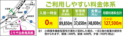「健康不安があり、一人暮らしを続けていけるか心配」「要介護になったら、老人ホーム以外の選択肢はないのかしら?」「介護が必要でも、なるべく自宅にいる感覚で過ごしたい」そんな方にぴったりの「高齢者向住宅」を今回はご紹介。真鶴駅の目の前、徒歩1分の好立地にあり、買い物や周辺観光地へのアクセスにも大変便利なのが、家具付高齢者向住宅「ミモザ白寿庵真鶴」。高額な入居一時金はなく、礼金も0円。入居時に必要なお金はお預かりする敷金(家賃3カ月分)のみ。車椅子の方でもご利用できるバリアフリー設計だ。介護サービス(小規模多機能型居宅介護※別途契約)も併設しており、夜間の見守りが必要な要介護の方でも安心して利用できるのが特徴。月額利用料は、12万7500円で、介護サービスの利用契約をした場合、3食付でも月額利用料が約18万円程度。「料金が手頃」というのも人気の点だ。