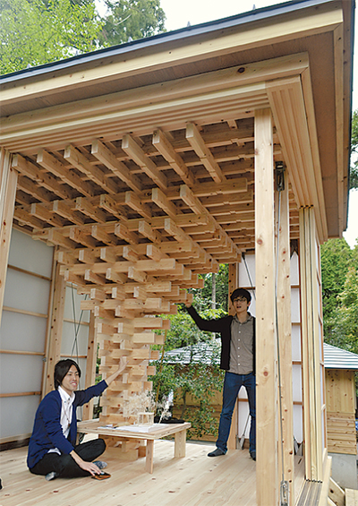 最優秀賞に選ばれた「積み木の家」にはヒノキの他、ケヤキの直径が短い小径木や節に虫の入った間伐材なども使われ、小田原大工職組合や小田原地区木材業協同組合の協力により、約1カ月で建てられた。縦横に組まれた木の様子が「寄木のイメージにマッチし、インパクトがある」と評価された。下田さんは「『積む・組む』という、シンプルなデザインが活きる家をイメージした。受賞はうれしいです」と喜びを語った。