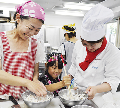 7歳から78歳まで25人の参加者は、併設の介護付有料老人ホームジョイアス城山の檜山大亮(だいすけ)料理長指導のもと、「片口鰯と春夏野菜のかき揚げ」に挑戦。市内から参加した関野朋美さん・愛莉さん(7)親子は先生指導のもと、「子どもと触れ合いながら楽しく料理ができた。家では焼魚くらいしかしないので、これを機会にいろいろな魚料理にチャレンジしてみたい」と笑顔で語った。