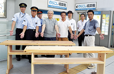 駅には、樹齢約100年の杉と70〜80年のヒノキ材のテーブルが登場。林青会と清閑亭の焼き印が押され、駅構内改札口手前に設置された。鈴木駅長は「地元産木材のぬくもりとともに、箱根の玄関口・小田原のPRを手助けできれば」と今後の活用を約束した。