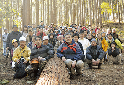 大会には木工技術の向上と伝承のため、全国各地から大工や指物師などの職人が集まる。この日伐採された杉は、鉋削りの薄さ、長さ、幅の広さを競うために使われる。芹澤実行委員長は「木に関わる者すべてが総力を挙げて大会に臨みたい。その弾みになった」と話した。