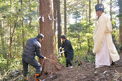 市内荻窪の辻村農園「天守の森」で11月30日、澄み切った空気のなか、「斧立(おのたて)の儀」が執り行われ、杉が切り倒された。この杉がスポットライトを浴びるのは、来年11月に開催予定の「第30回全国削ろう会 小田原大会」(芹澤毅実行委員長)。