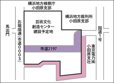 芸術文化創造センターに関する市民説明会が明日7月6日(日)、市民会館小ホールで開催される。午後6時から。5月末から幸、十字地区を対象に行われた説明会は、市道2197(上図・紫)の廃止と南側生活道路(同・ピンク)の整備について理解を求める市と、安全面を危惧する住民の間で平行線の議論が続いている。