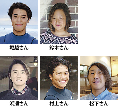 松下諒大さん(18・湯河原町在住・3年連続)、村上舜(かい)さん(18・湯河原町在住・3年連続)、浜瀬海さん(17・日本サーフアカデミー在籍・初選出)。