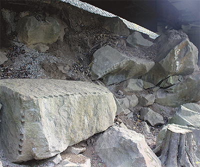 丁場跡は、早川の石垣山一夜城跡を箱根方面へ650mほど進んだ箕ケ窪橋の下。2005〜06年に広域農道小田原湯河原線建設に伴う発掘調査で出土した。1604(慶長9)年から36(寛永13)年にかけて行われた江戸城改修に用いる石垣の石材を採石、加工した丁場跡を構成する遺跡の一つで、石材を割るための矢穴、刻印や加工が施された石材など、石材の形を整える作業が行われた様子が確認できる。