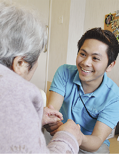 ディッキーさんは、フィリピンのミンダナオ国際大学卒業後、この制度を利用して来日。施設で働きながら、資格取得に向け勉学にいそしんできた。来日当初こそ母国との気温差に慣れず、長袖の洋服を何枚も着込んで生活していたというが、今ではすっかり小田原での生活にも慣れ、シティーモールや小田原駅周辺がお気に入りのスポット。「小田原駅前のラーメン屋が美味しくて」とすっかり小田原通だ。