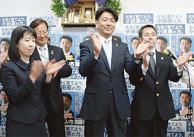 午後5時4分。選挙管理委員会から他に立候補者がいなかったため、無投票での3選が確定したとの一報が事務所に入った。30分後、遊説活動を切り上げ、事務所に戻ってきた加藤氏を支援者や南足柄市の加藤修平市長ら近隣の首長、議員らが拍手とねぎらいの言葉で出迎えた。