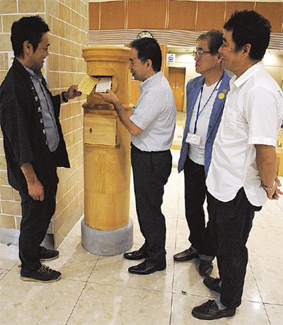協力団体の一つ、報徳の森プロジェクトの高木大輔さん(44)と郵便局長協会東部会の川瀬潤(ゆたか)さん(46)は、早速知人にあてたハガキを投函。その様子を見守っていた(株)ラ・ルースの相田秀和社長(52)は「市民はもちろん、ハルネを訪れる観光客や外国人にも、小田原産ヒノキのハガキを発信してほしい」と話した。