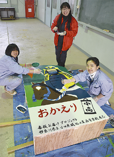 城北工業高校デザイン科1年生の4人が、福島県南相馬市小高区のJR小高駅構内に設置する顔出しパネルを製作した。同校非常勤講師で、震災後5年にわたり被災地を訪れている北村千波さん=人物風土記で紹介=の呼びかけによるもの。