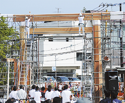 午後からは「立柱祭」として、運ばれた笠木などをもとに作業を開始。職人らにより木遣り歌が歌われるなか、最後は木槌で笠木をおさめる作業が行われて鳥居が完成した。草山明久宮司は「ただただ感謝を申し上げるだけ。御祭神もきっと喜んでくださっていると思う」と述べた。