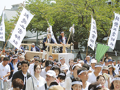 「二宮神社の鳥居 皆でひこう ワッショイ ワッショイ」。掛け声をあげながら、紐を引いて歩くコースは馬出門から神社まで約500m。真鶴町から参加した長瀬行男さん(56)は「50年に1度と聞いたら参加しないわけにはいかなかった。厳かな気持ちになりました」、長田心都ちゃん(富士見小4年)は「お父さんとお母さんが結婚式をあげた神社。鳥居を引っ張ることができてすごく嬉しかった」と感想を話した。