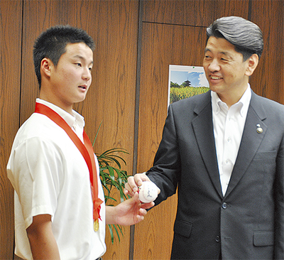 また、加藤市長からボールにサインを頼まれ「今、練習している最中」と照れながら応じると、市長も「これからの活躍でこのボールの価値が上がっていくことに期待する」と微笑みながらエールを送った。