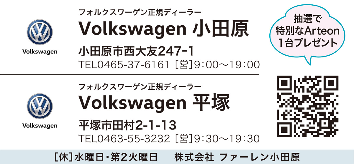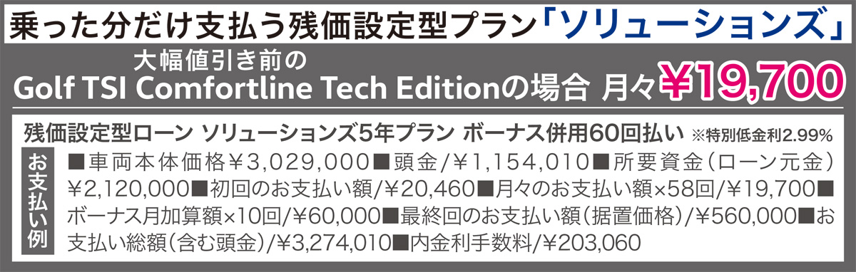 そんな小酒部さんが「良心的でうれしい買い方」と話すのが、約2人に1人が選んでいる残価設定型プラン「ソリューションズ」。あらかじめ設定した据置価格での買取保証がついているから、「乗った分だけ支払えばOK」。VW小田原/平塚では新元号「令和」を記念して、大幅値引きとゴルフシリーズ全車種に用品10万円分をプレゼント。詳しくはショールームへ。