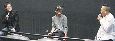 小田原コロナシネマワールドで行われたクロージング上映は、南足柄市出身、勝又悠監督の『いつかの、玄関たちと、』。上映終了後、勝又監督と、監督と同級生で作品のプロデューサーを務めた中村勇介さんが、映画や地元に対する熱い想いや撮影当時の裏話を披露した=写真右下。