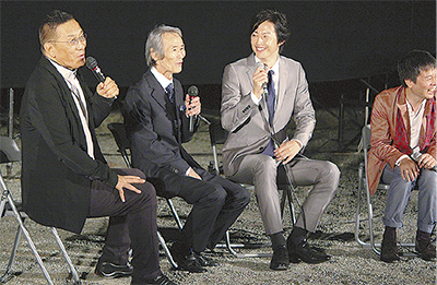 オープニングを飾る小田原城銅門での野外上映会には、上映作品『太秦ライムライト』主演の福本清三さん、小田原ふるさと大使で作品にも出演している合田雅吏さん、同じく出演の阿藤快映画祭実行委員長ら=写真左上=によるトークショーが行われた。