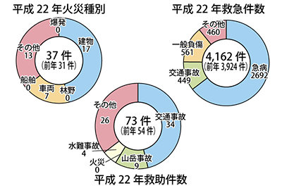 一方、平成22年の救急出場件数は4162件(前年3924件)、救助出場件数が73件(前年54件)とこちらも増加している。1日当たりの出場件数は11・4件(前年10・8件)。