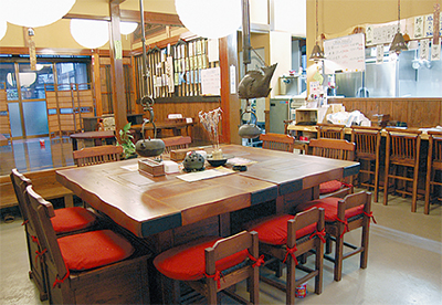 築百年ぐらいを経たこの建物は、昔はお茶屋だったという。松や帆掛け舟が彫られた欄間や書院棚がそのまま残っており歴史的にも価値がある。存在感を示す大きな囲炉裏テーブルは1人でもゆっくりできる。板間の座敷では女性客らがビール片手に会話が進んでいた。