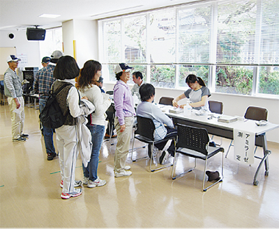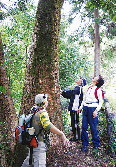 今回のツアーは平成24年度上旬には森林セラピー事業をグランド(正式)オープンさせたい同町が、基地認定を記念しプレイベントとして実施したもの。当日は近隣地域や千葉県、東京都などから、30代から70代までの男女32人が参加した。参加者らは最初に山北町健康福祉センターで、血圧やストレス度をチェックする唾液アミラーゼを測定。その後、準備運動を経て約2・5キロのコースを途中、昼食などをはさみながら3時間半かけて歩いた。参加者らはガイドの指導に従って、ところどころで立ち止まっては、風や鳥、水の音などに耳を傾け、また、大きな木の幹を手で触るなどし、”五感”を使って森林浴による癒し感を体感した。