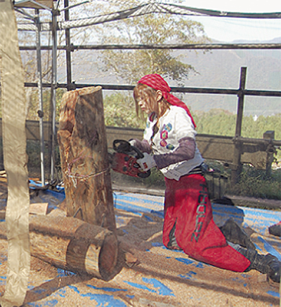 「チェンソーアート大会IN大野山」が10月29日、県立大野山乳牛育成牧場で開かれた。この大会は来年3月予定の第1回神奈川チェンソーアート競技大会のプレイベントにあたるもの。選手9人は、地元産の間伐材からできた丸太にチェンソーを使い表現豊かな作品を2時間半かけて作った。この日大野山では恒例のフェスティバルも開催。多くのハイカーらが会場に足を止めて応援していた。