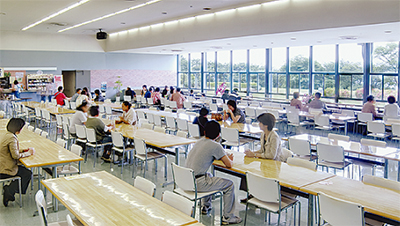 一歩中に入ると、全面ガラス張りの窓越しに緑の庭園が飛びこんでくる。清涼感ある池、芝生、木々の間からサツキの花が鮮やか。セルフサービスでコーヒー、紅茶、日本茶が20種類以上用意され何杯でも自由に飲める。