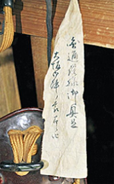 この甲冑は400年以上前の安土桃山(戦国)時代に造られたもの。この時代の甲冑に相応しく実戦を想定した実用重視の造りをしているが、金箔の上に透漆をかけた「白檀塗」や、革の小片を並べ重ねて紐で綴じた「本小札(ほんこざね)」等の細工の見事さ、背中に「旗差し」が無いこと等から大名が着用した鎧と分かる。また添え書きに「円通院(明成の戒名)様 御具足」「大坂の陣」の文字も見える。