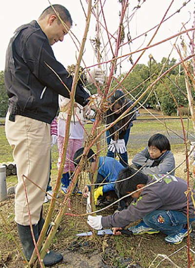 上大井小学校の5年生52人が12月4日、大井町西大井のNEC湘南テクニカルセンター敷地内で、同センター従業員と一緒にケナフの刈り取りを行った。