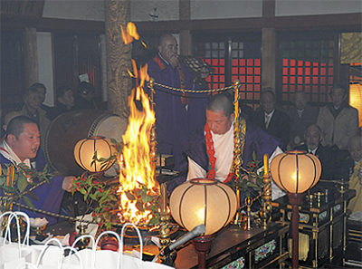続いて、毘沙門堂へ入り、名誉住職・山地裕昭師ら真言宗の十余人の僧侶によって大護摩を焚き七難即滅、七福即生をはかる「福寿開運祈祷護摩」が執り行われ、力強い読経が新春の堂内に響いた。