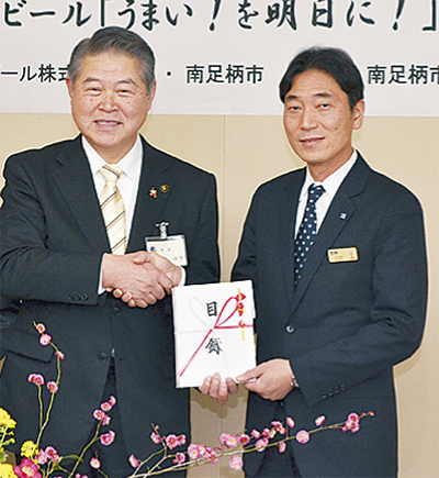 アサヒビール(株)横浜統括支社の田淵万平(みつひら)理事支社長らが2月7日、南足柄市役所を訪れ、県内で販売されたアサヒスーパードライの売上げの中から同市へ200万円、同市森林組合に130万円を寄付した。