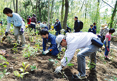 使用された苗木は、知的障害者の生活支援や就労支援を行う社会福祉法人進和学園(平塚市)の利用者がどんぐりの実から育てたもの。同法人では、横浜国大名誉教授の宮脇昭氏が提唱する「潜在自然植生」に基づき、2006年から「いのちの森づくり」プロジェクトと題し、苗木の栽培・販売による障害者の労働創出や、スギ・ヒノキなどの人工林に代わる自然植生の森林再生等に取り組んでいる。この考えに共鳴した小宮オーナーの計らいで、昨年4月に第1回の植樹祭を開き、敷地内の山林に苗木250本を植樹した。