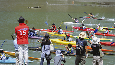 今回は関東を中心に、北は北海道から西は三重県まで257人がエントリー。当日は242人が受付し大会に臨んだ。 競技は10キロコースと5キロコース、艇種別に13種目が用意された。湖の水位が平年よりも低かったため、救命胴衣を付けた湯川裕司山北町長がボートの上でスタートの号砲を鳴らすと、玄倉側の湖面に並んでいた艇がいっせいにスタート。みるまに小さくなっていく選手たちに観客らは大きな声援を送っていた。
