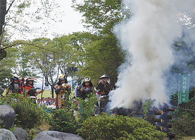 山北町の河村城址など7カ所で9月29日、戦国時代をほうふつさせる「のろし上げ」のリレーが行われた。初代河村秀高以来の河村氏の往時を偲ぶ「河村城まつり」に合わせて実施されたもので、小田原市や南足柄市から「甲冑隊」もかけつけ会場を盛り上げた。リレーはほぼ予定通り順番に行うことができた。河村城址にはのろし上げを見ようと、歴史に関心を持つ人らも訪れた。