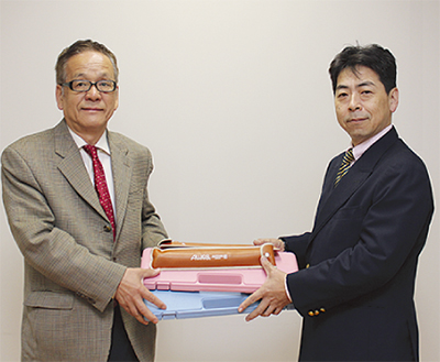 集まった楽器は18日、松田町役場で前会長の松島隆さんから岩井事務局長に手渡された。「今後も協力を継続し、お渡しできる数を増やしていければ」と話す松島さんに、岩井事務局長は「皆さんのお気持ちがなによりです」と感謝を述べた。
