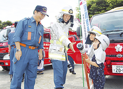 開成幼稚園(宇田川裕子園長)で7月12日に夏祭りが催され、開成町消防団(石井勝団長)の第4分団と特設第1分団が参加して、ポンプ車の展示などを通じて日頃の活動をPRした。