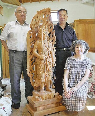 不動明王像は丹沢のケヤキを材料に、幸蔵さんが1998年に彫り上げた全高150センチの立像。幸蔵さんが他界した後も自宅のアトリエで妻の喜代美さん(67)が大切に保管していた。