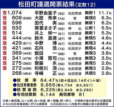 任期満了に伴う松田町議会議員選挙の投開票が9月13日にあり、新人4人と現職8人が当選した。無所属新人の平野由里子氏(52)が過去最多の1074票を獲得してトップ当選を果たすなど新人が上位を占めた。一方で投票率は過去最低の64・47%で町民の政治離れが浮き彫りとなった。