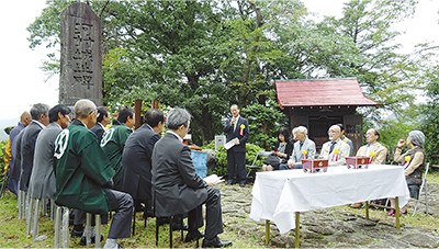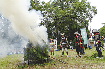 山北町の河村城址歴史公園で9月28日に河村城まつりが開かれ、河村氏一族の供養や甲冑隊によるのろし上げ=写真左が行われた。河村氏の子孫で衆議院議員(山口3区)の河村建夫さんも昨年に続き出席した。