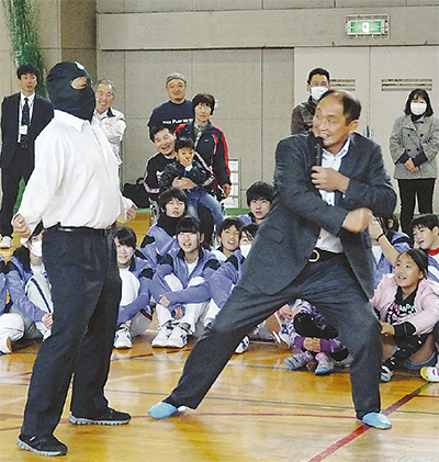 いじめをテーマに講演した大谷選手は「夢を持ち頑張り続ける人に、いじめをする人はいない。夢を持ってほしい」と生徒らに語りかけ、職員を相手に水平チョップも披露した。